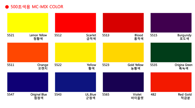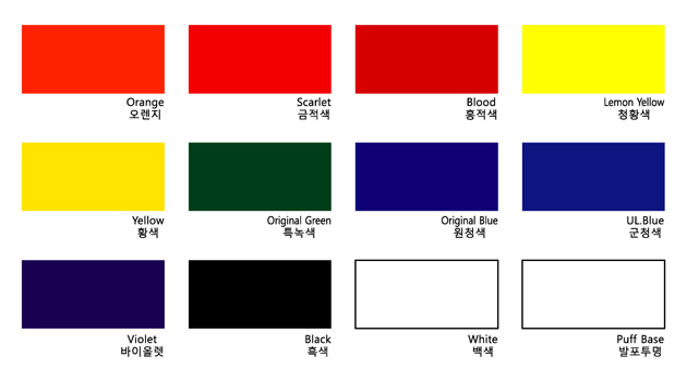 - 조색 잉크는 고농도의 단일색으로 조성되어 있으나 일부 색상은 안료의 특성상 은폐력이 약하기 때문에