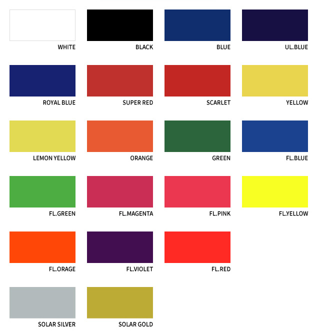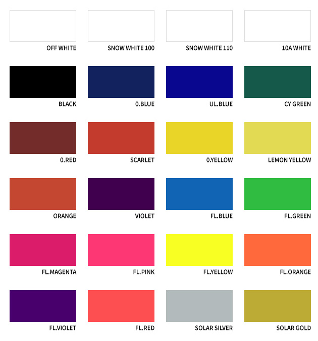 It compounded in high concealment but flourescent color is less of concealment and so it should be printed in white color advance and print. - 700GROUP : (플라스티졸 발포형광)은폐력이 좋아 농색천이나 흑색천에 사용되며 무광으로 제조된다.