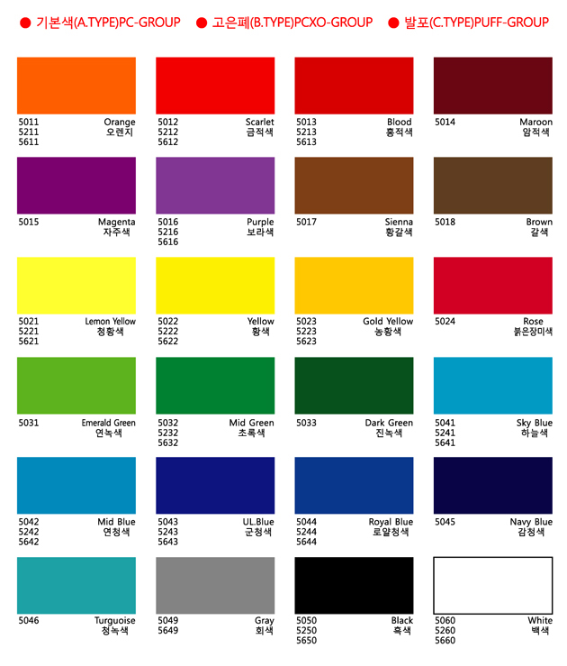 C. TYPE PC-Group일반 잉크에 발포제를 섞어 사용시 접착력이 약하고 신축성이 결여되어 갈라지는 현상을 보안함과 동시에 효과의 극대화를 이룬제품.