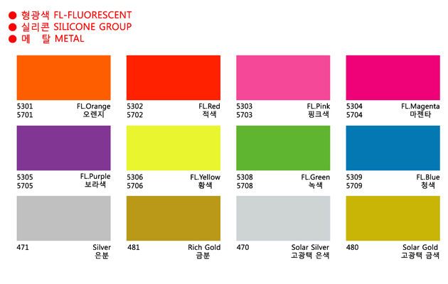 It has good concealment and so used for black fabric as backer and manufactured in matt effect. - SL GROUP : (실리콘형광)실리콘잉크참조.